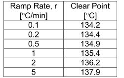 澄清點(diǎn)比起始點(diǎn)更被加熱斜坡速率嚴(yán)重影響。一般來(lái)說(shuō),澄清點(diǎn)隨著斜坡率的增加而增加(見(jiàn)表1)。