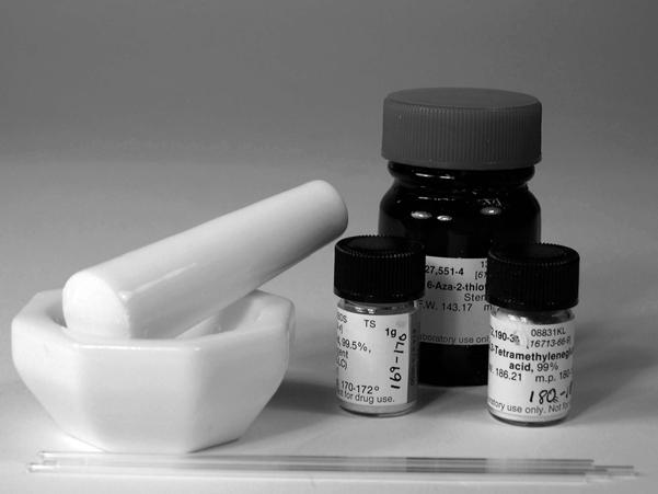 熔點(diǎn)降低現(xiàn)象可應(yīng)用于鑒定未知純度的物質(zhì)。例如,如果您測(cè)量樣品熔點(diǎn)在160°C,您檢索藥典的熔點(diǎn)表會(huì)發(fā)現(xiàn),這代表了幾種不同的參考化合物,但是它們的熔點(diǎn)相同。該物質(zhì)可以利用它的混合熔點(diǎn)來(lái)確定:樣品與少量的參考樣品逐個(gè)混合,并確定每種情況下的混合熔點(diǎn)。當(dāng)樣品被混入少量的參照物而熔點(diǎn)降低時(shí),這兩種物質(zhì)不可能是相同的。然而,如果混合物的熔點(diǎn)不下降,則加入的參照物與樣品相同(即樣品已被鑒定)。