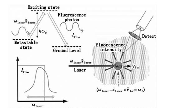 圖1[1]為LIF的基本原理圖,在一個(gè)三能級(jí)系統(tǒng)中:離子處于亞穩(wěn)態(tài)時(shí),當(dāng)照射激光能量等于躍遷激發(fā)的能量,離子被泵浦到激發(fā)態(tài)。由于激發(fā)態(tài)不穩(wěn)定,離子又會(huì)迅速退激到基態(tài)并輻射出熒光。在激發(fā)態(tài)上停留時(shí)間很短暫(一般只有幾納秒寬度)。由于離子不是靜止的,根據(jù)多普勒效應(yīng)可知,在激光傳輸方向上存在一個(gè)速度選擇,只有在激光傳輸方向上滿足一定速度的離子才能被特定頻率的激光誘導(dǎo)激發(fā):窄帶激光束(ωlaser,κlaser)入射,在入射方向上,只有離子速度 和激光頻率滿足關(guān)系式 時(shí),才能通過相應(yīng)的激光激發(fā)被泵浦到激發(fā)態(tài)。對(duì)入射激光頻率進(jìn)行掃描變換,測(cè)量相應(yīng)的熒光光強(qiáng)變化,就能得到亞穩(wěn)態(tài)離子速度分布函數(shù)在入射激光方向上的投影。如果假定亞穩(wěn)態(tài)離子溫度和主體基態(tài)離子溫度一致,離子速度分布函數(shù)等動(dòng)力學(xué)參數(shù)即可獲得。