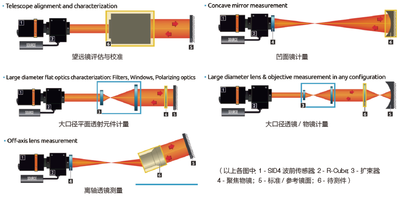 典型光學(xué)元件計(jì)量的光路可以R-Cube 和SID4 為核心靈活搭建: