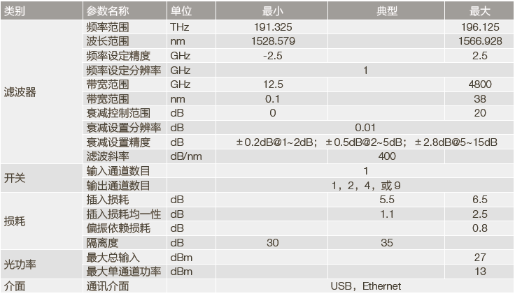 WSS-1000 可實現(xiàn)濾波曲線的多方面編程,包括濾波線形、衰減、多通道濾波、端口(1×1,1×2,1×4,1×9)選擇等。