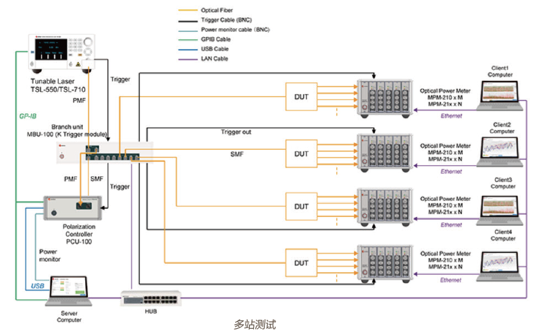 多站測試中,TSL、PCU與MCU 構(gòu)成一個(gè)服務(wù)中心,分發(fā)觸發(fā)信號及光束到不同的測試站。每個(gè)測試站包括功率計(jì)和客戶端PC。在運(yùn)行過程中,TS持續(xù)的掃頻,使得每個(gè)測試站可以獨(dú)立而并行地工作。多站測試架構(gòu)極大提升了高精度測量與分析的效率。