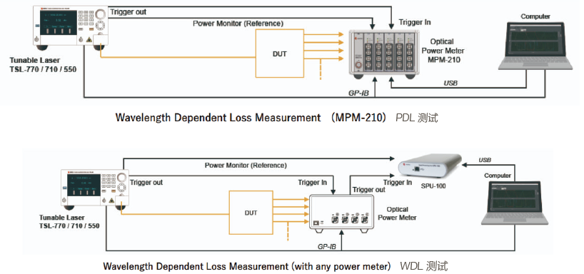 快速掃描測量系統(tǒng)整合了TSL 可調(diào)諧激光器、MPM 光功率計(jì)、PCU 偏振控制器及根據(jù)用戶需求自定義的軟件,為R&D 及生產(chǎn)環(huán)境的IL、WDL、PDL 測試提供快速、多功能、全自動的平臺。系統(tǒng)同時(shí)采集可調(diào)諧光源的輸出功率及DUT 透過的光功率作實(shí)時(shí)參比,獲取高精度的IL、WDL 以及PDL(采用Muller 矩陣方法)。