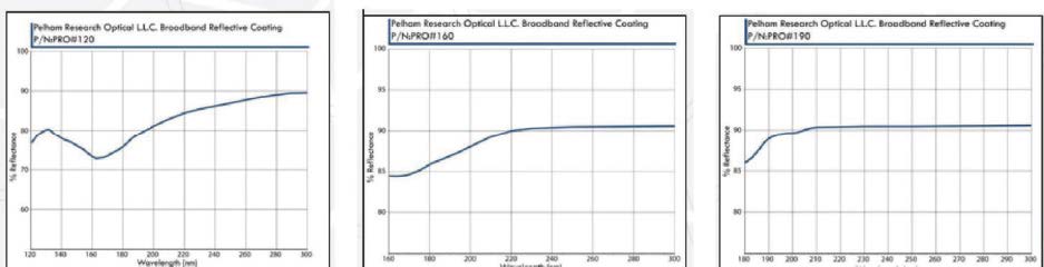 Pelham Research Optical(PRO)VUV / UV 寬帶鏡面涂層設計用于在真空臨界波長下提供良好的反射率。 為了確保質量的一致性,每個涂層批次在12 度入射角下測量反射率??梢愿鶕?jù)客