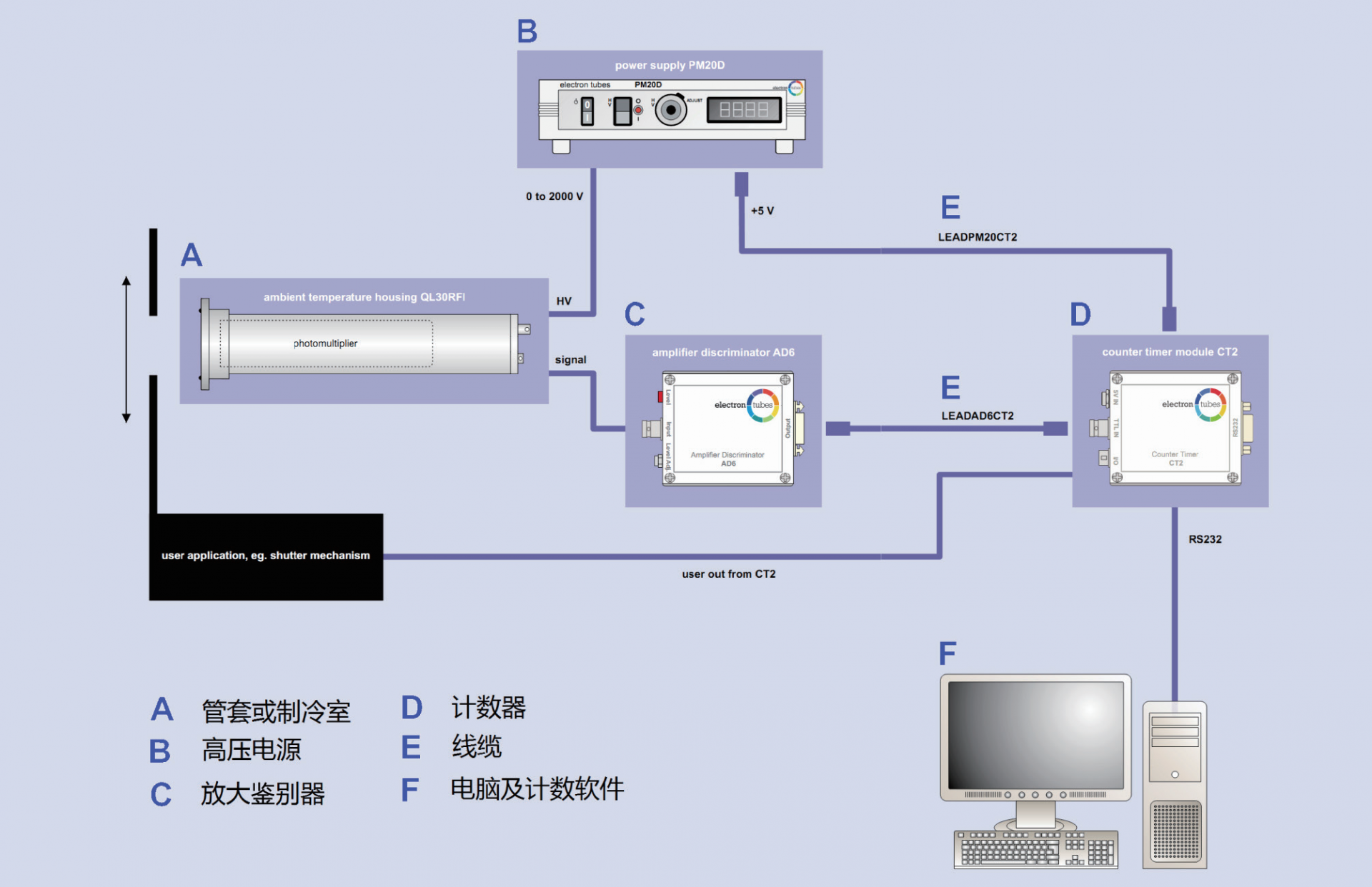 ET公司可以提供整套的光子探測(cè)系統(tǒng)以及相應(yīng)的解決方案,方便客戶自己進(jìn)行搭建。下面是使用30mm光電倍增管作為示例 組件的一套光子計(jì)數(shù)型光子探測(cè)系統(tǒng),系統(tǒng)組成以及電腦端軟件界面如下。
