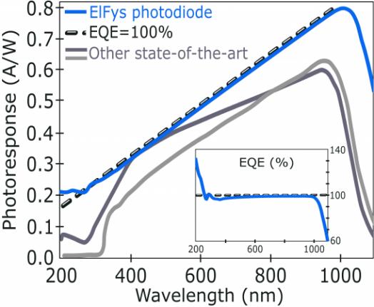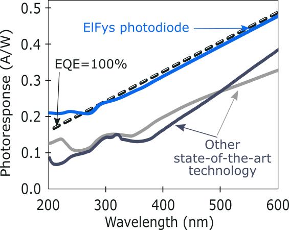 此光電探測器在紫外波段也同樣具有極高的量子效率,比普通的硅光電二極管高出兩倍以上。