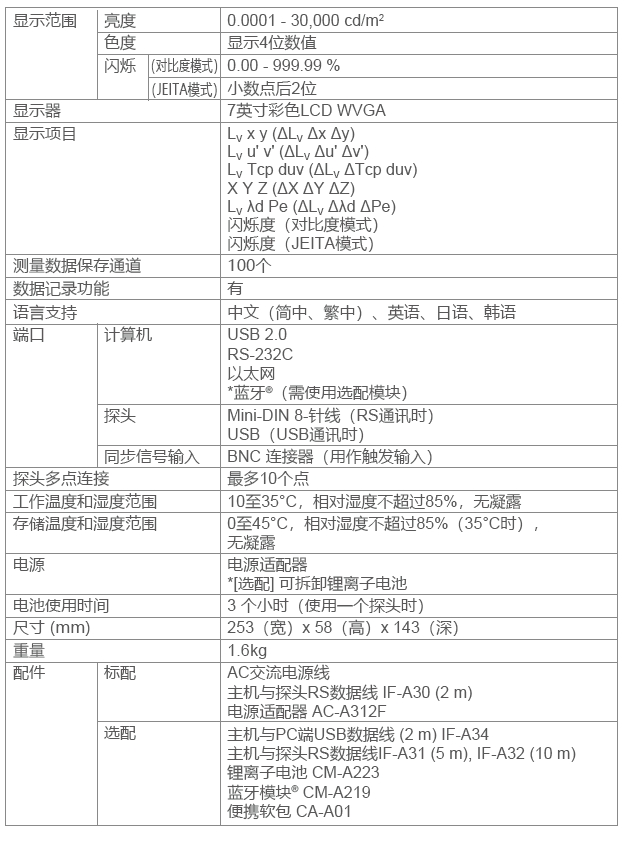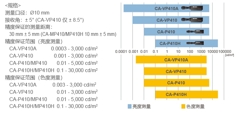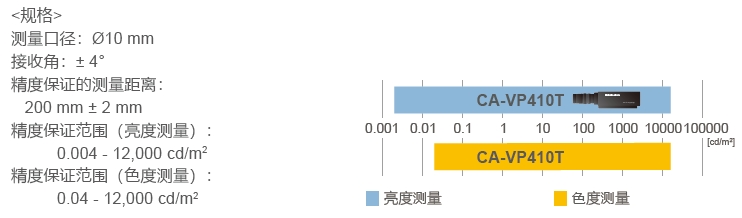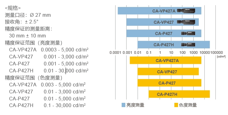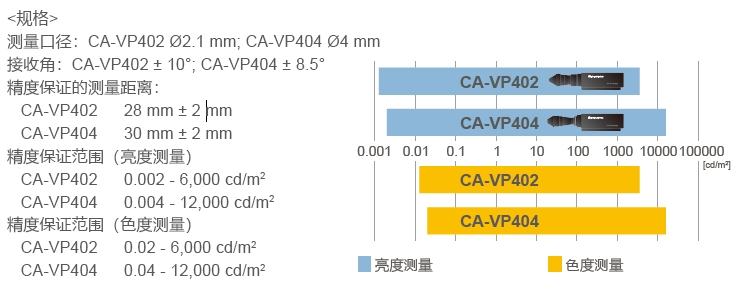 進(jìn)階版高靈敏度探頭CA-VP427A和CA-VP410A作為系列新產(chǎn)品,從0.0003cd/m2的超低亮度開始,保證精度范圍。