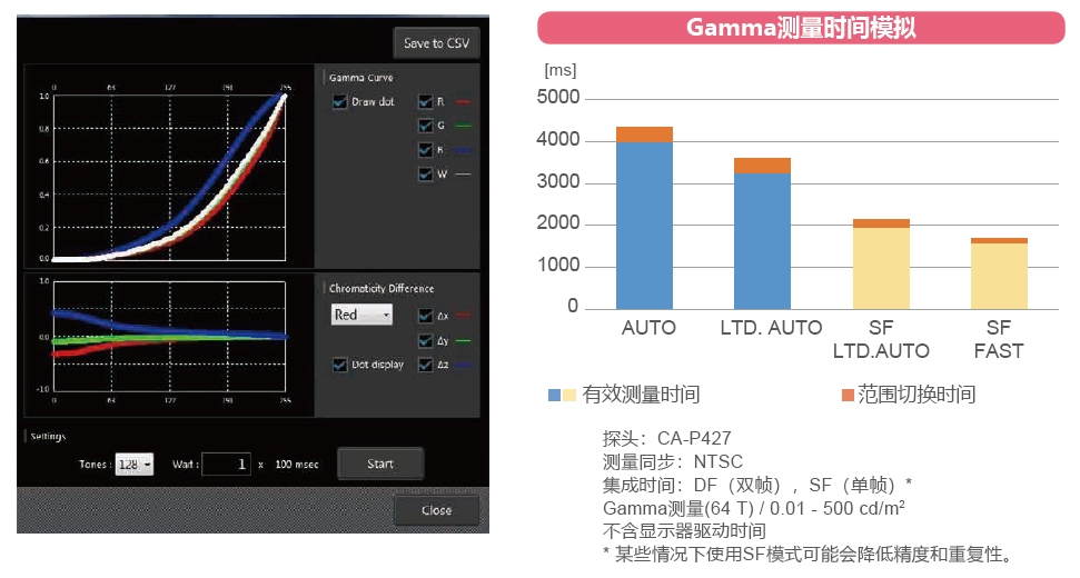 憑借高傳感器靈敏度和高速計算性能,CA-410縮短了多次執(zhí)行亮度和色度評估和調(diào)整(如Gamma測試)所需的時間。甚至為了進(jìn)一步提高速度性能,CA-410提供了LTD。AUTO模式,增加測量速度,同時保持與CA-310相同或更好的精度。此外,(SF單幀)模式允許用戶設(shè)置積分時間以增加同步測量。其設(shè)計目標(biāo)是在以測量速度為關(guān)鍵的過程(如OLED的產(chǎn)線色彩調(diào)整)中提高生產(chǎn)率。