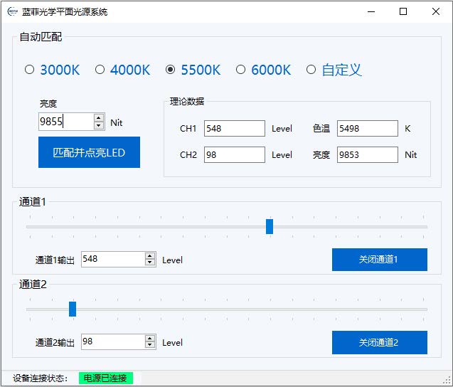 LED 面板光源是一款可用于相機模組或傳感器產(chǎn)線校準的光源模擬器。選用兩組高低色溫的 LED 模塊實現(xiàn) 3000K~6000K 任意色溫和 100~15000Nit 任意亮度的大動態(tài)范圍輸出。并且保證有效發(fā)光面 200x200mm 內(nèi) 95%以上的均勻性??商峁┎煌Z言版本的 SDK 接口使用戶可集成到自有控制軟件。