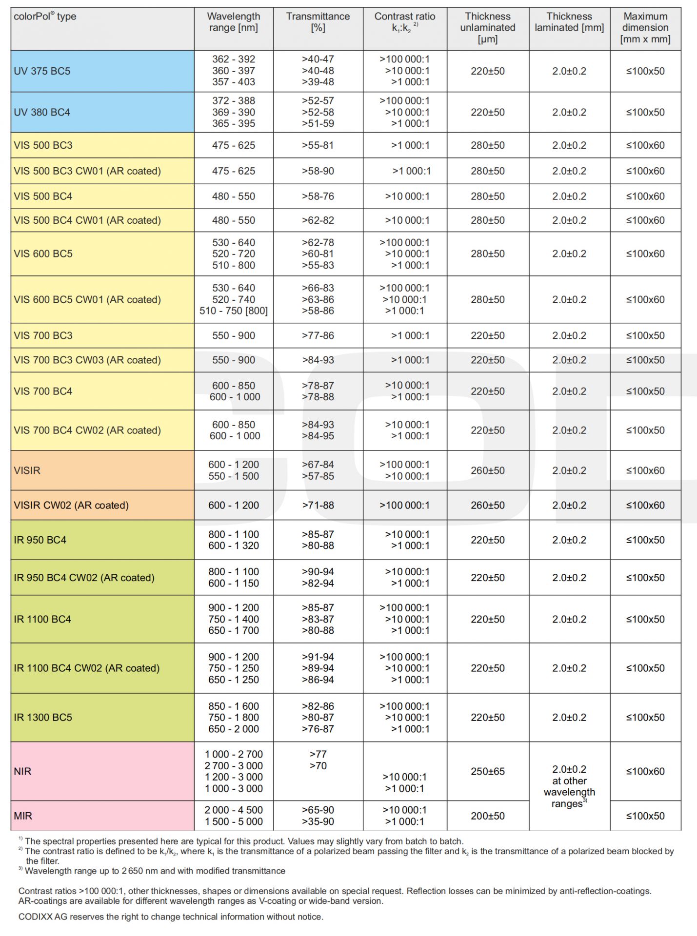 colorPol? 偏振片是由帶有銀納米顆粒的高強(qiáng)度鈣鈉玻璃制成的二向色玻璃偏振片??捎貌ㄩL范圍從紫外到5um的中波紅外。紫外波段最高透過率可以接近60%,可見波段最高透過率可以超過90%,紅外波段的透過率可以達(dá)到94%