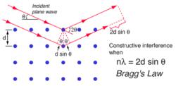 布拉格定律:當(dāng)X射線束的入射角滿足晶面間X射線路徑長度的差值為波長的整數(shù)倍時,就會發(fā)生相長干涉,產(chǎn)生衍射光束