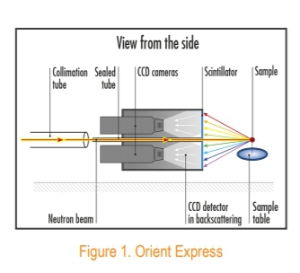 早期搭建的經(jīng)典勞厄相機(jī)與PSEL合作完成,通過使用膠片和暗室顯影設(shè)備搭建的Orient-Express,主要應(yīng)用于快速檢查晶體質(zhì)量和定向。它由兩個(gè)PSEL相機(jī)組成,觀察一個(gè)平面閃爍體。入射的白中子束通過相機(jī)后,在反向散射位置撞擊樣品。衍射圖樣從相機(jī)機(jī)中讀出,完成拼接,顯示在電腦屏幕上。曝光時(shí)間一般在幾秒鐘到幾分鐘之間,大約在5年前,這套系統(tǒng)升級(jí)為CCD探測器,具備更高的通訊速度。